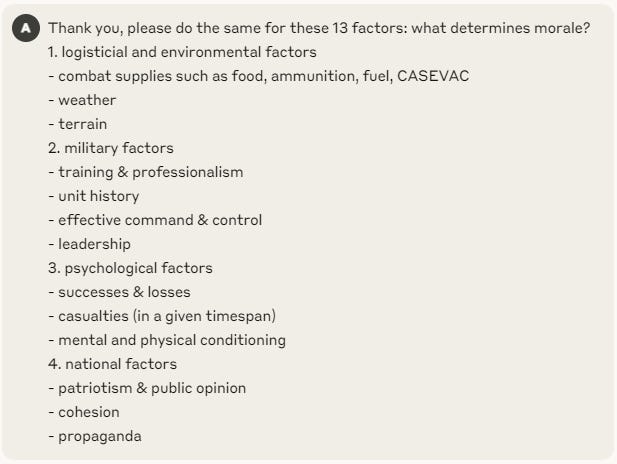 I think it would be interesting to have a wargame with six AI agents, one for each of the six disciplines of operational art that Friedman identified in the book, where your job as the player is to configure, deploy and collaborate with them as needed.